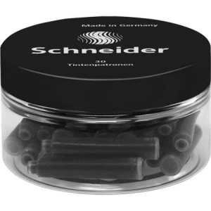 30 Stk. sorte Schneider fyldepennepatroner. Patronerne er internationale standardpatroner. Passer bl.a. til: Montblanc, Delta, Visconti, Montegrappa, Pelikan, Faber-Castell, Italix, Caran d’Ache, Sigma, Bexley, Monteverde, Schneider, de fleste Waterman og Rotring samt stort set alle kinesiske penne. Leveres i fiks dåse med skruelåg. Billige fyldepennepatroner, javist, men der er ikke gået på kompromis med kvaliteten.