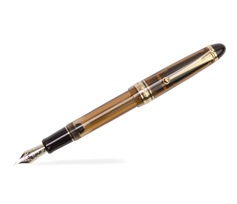 Pilot Custom 823 fyldepen sort transparent. I rav/brun transparent finish, demonstrator. Pennen er udstyret med en 14 kt. guldspids. Med forgyldt staffage. Pennen er en stempelfylder (bruger blæk fra flaske). En virkelig lækker og præsentabel pen i den klassiske cigarfacon.